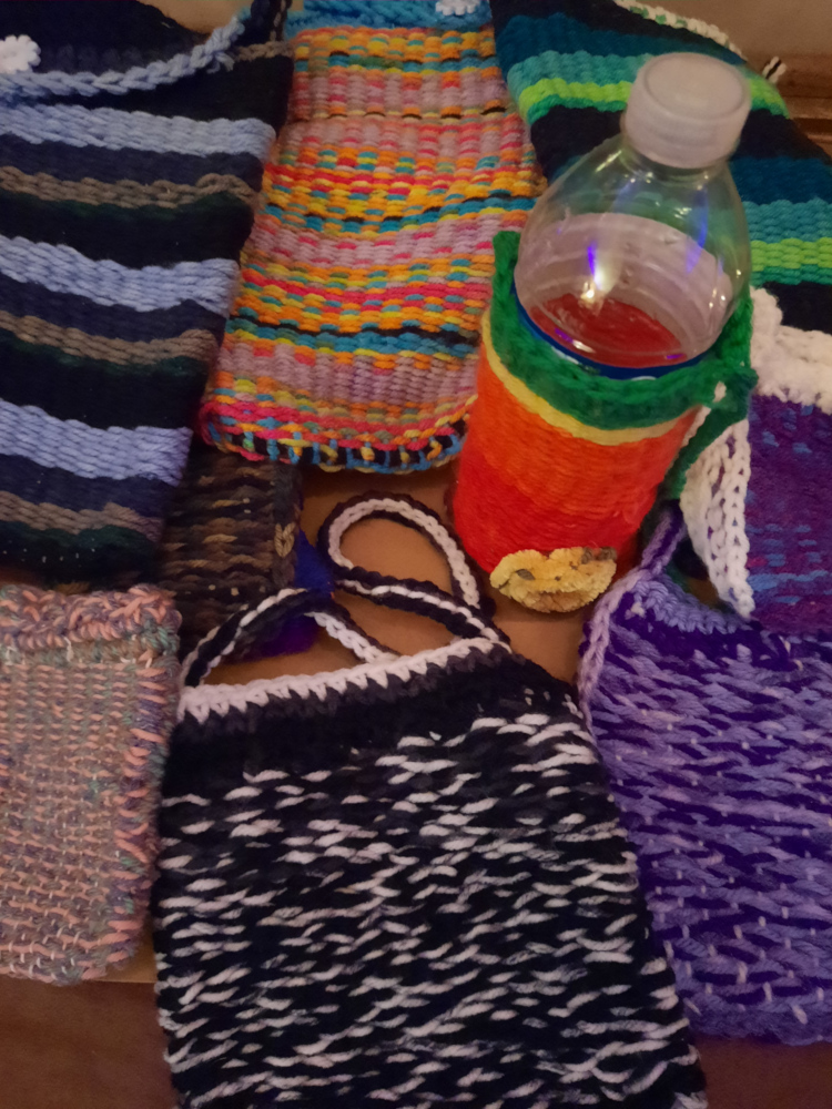 Acrylic on canvas with crocheted trees and clouds 15" × 30"